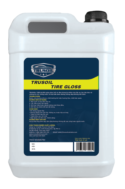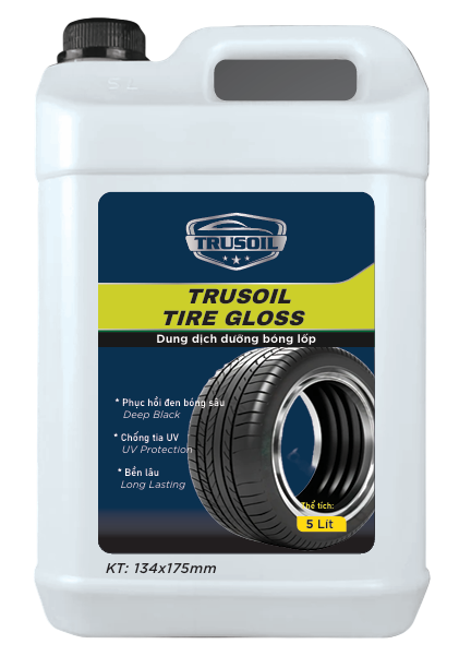 Mô tả sản phẩm : TRUSOIL TIRE GLOSS - 5 Lít sản phẩm cho garage chuyên nghiệp, giúp phục hồi vẻ đen bóng tự nhiên của lốp xe, tạo lớp bảo vệ chống tia UV, chống nước và bụi bẩn bám đường. Bóng đẹp không vết dính. |